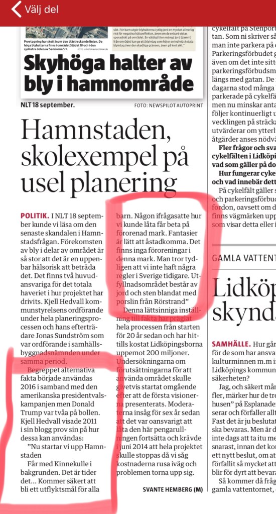 Svante Hemberg har fastnat för samma blogginlägg som jag, det inlägg där det förra kommunalrådet så lättsinnigt viftar bort riskerna med att barn och får vistas inom det kraftigt giftkontaminerade området.