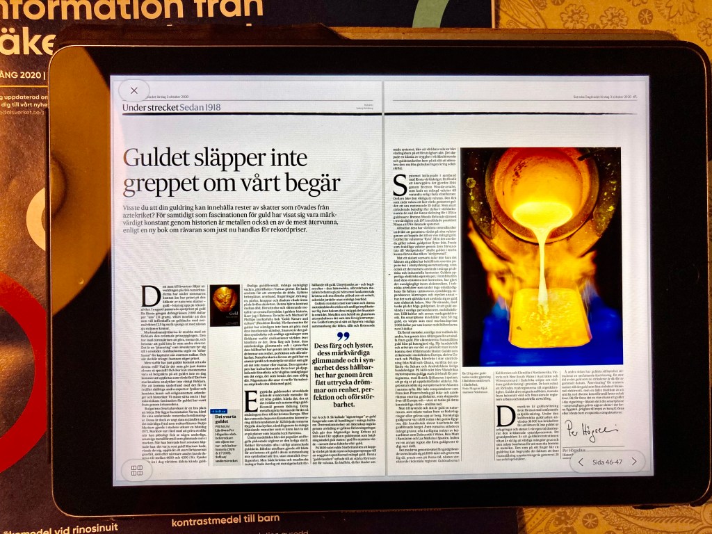 ”Dess färg och lyster, dess märkvärdiga glimmande och i synnerhet dess hållbarhet har genom åren fått uttrycka drömmar om renhet, perfektion och oförstörbarhet. Naturforskarna lär oss att guld har en atomär profil och molekylär struktur som gör att det inte rostar eller mattas. Den egenskapen har kulturhistoriskt förts över på djuplodande filosofiska och religiösa tankegångar om det eviga, det som består, det som aldrig dör.”