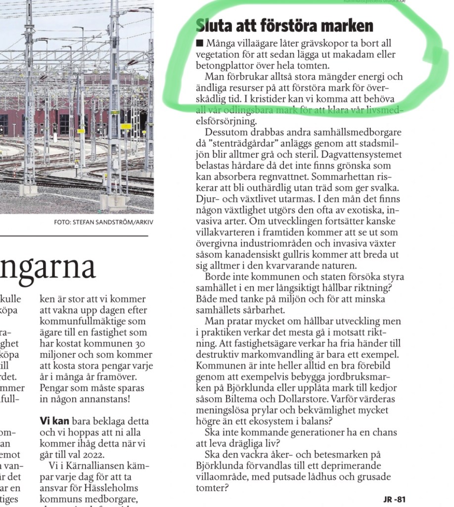 Även villaägarna utsätts för hård kritik, en kritik som inte saknar grund. Insändarskribenten avser då alla de som har haft det synnerligen dåliga omdömet att låta stensätta stora delar av den tomt som rimligtvis borde ha präglats av livgivande grönska.