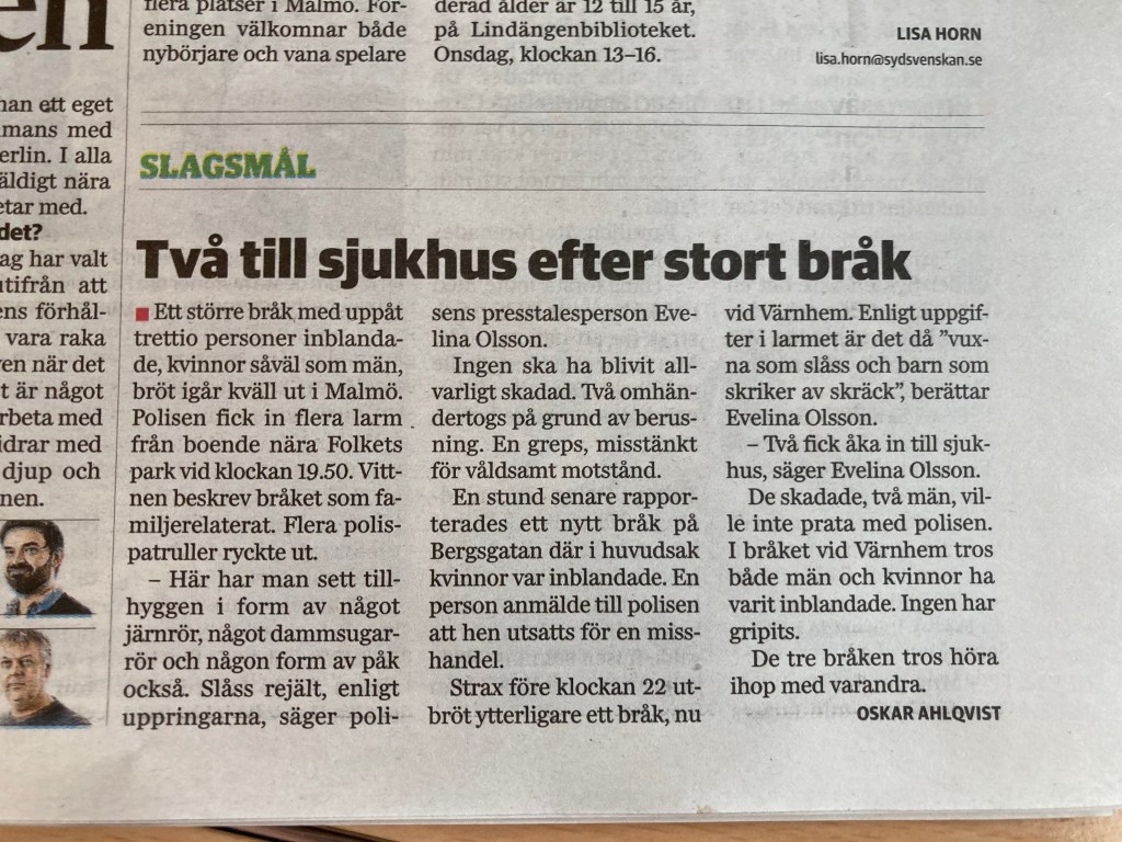 På X2000-tåget på Västkustbanan läser jag i Snällposten om ett slagsmål som skall ha ägt rum i Malmö förliden afton.
