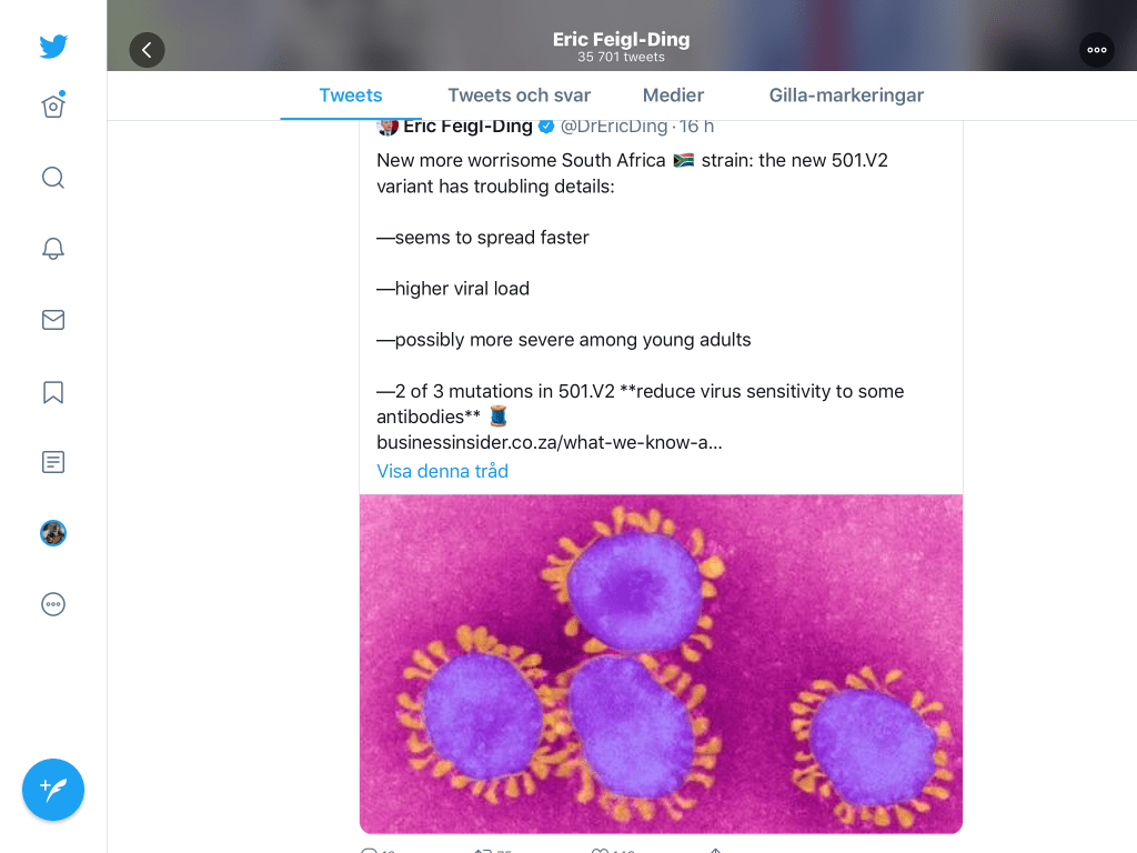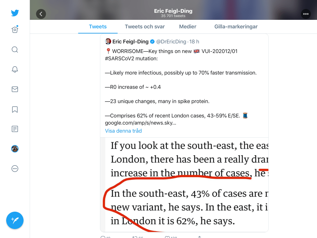 Mina källor på Twitter skriver först om mutationen i England som tycks höja R-talet rejält