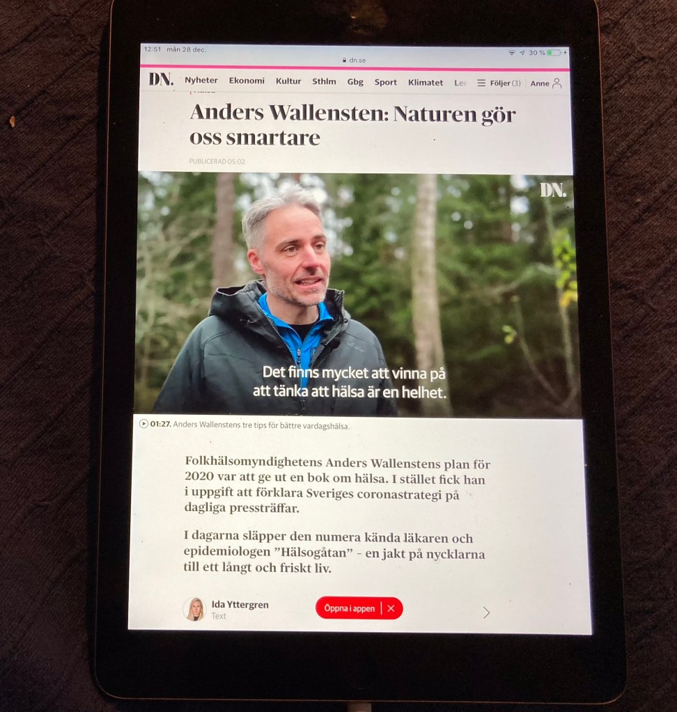 ”Wallensten skriver om hur några minuters tittande på träd, blommor eller vatten minskar ilska, oro och smärta. Att intervjun sker under en promenad utomhus i skogen under dagens ljusaste timmar torde ha stora hälsofördelar, enligt Anders Wallensten.