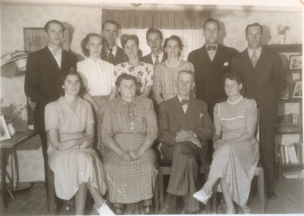 Det andra fotot måste vara från den tid då mormor och morfar hade sin bondgård utanför Varnhem. Troligtvis är fotot från senare delen av 1940-talet. Med på fotot är alla de tio barnen. Ingen av dem är i livet idag.
