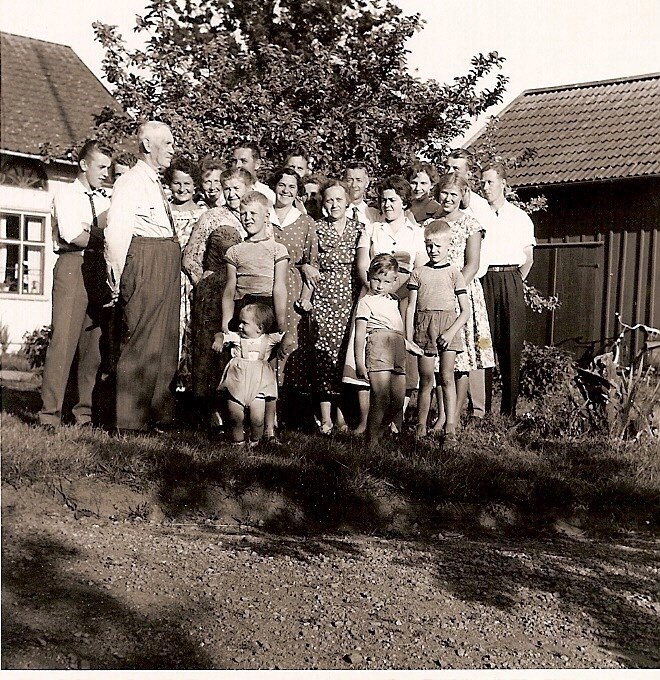 Först ett foto från Sätuna där en del av släkten är samlad för någon högtid. Med tanke på min ålder (jag står längst fram till höger i bild) borde fotot vara från slutet av 1950-talet. Min bror ”håller upp” vår kusin Anders. Kusin Mikael befinner sig intill mig.
