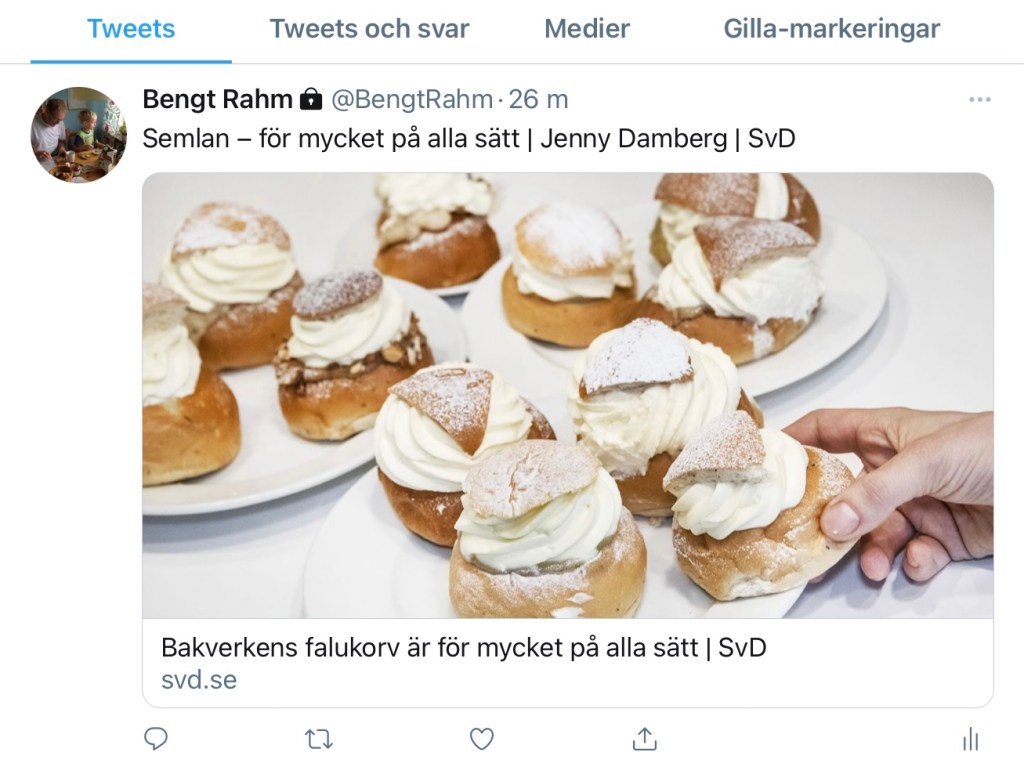 Ett uttryck för ett spritt Folkhälsomedvetande är definitivt inte dagens semla, gjord på vitt mjöl, socker, grädde, mandelmassa och florsocker. Men som folk säger, något måste man unna sig. Problemet är väl att unnandet sker alldeles på tok för ofta.