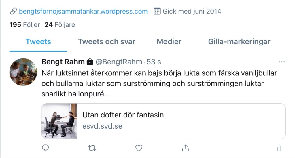 Avsaknad av luktförmåga (anosmi) kan inom loppet av några timmar övergå i luktförvrängning (parosmi). Att borsta tänderna kan bli som att hälla bensin på tungan. Kaffe, choklad, vitlök, gurka, parfym kan lukta kemiskt eller härsket.