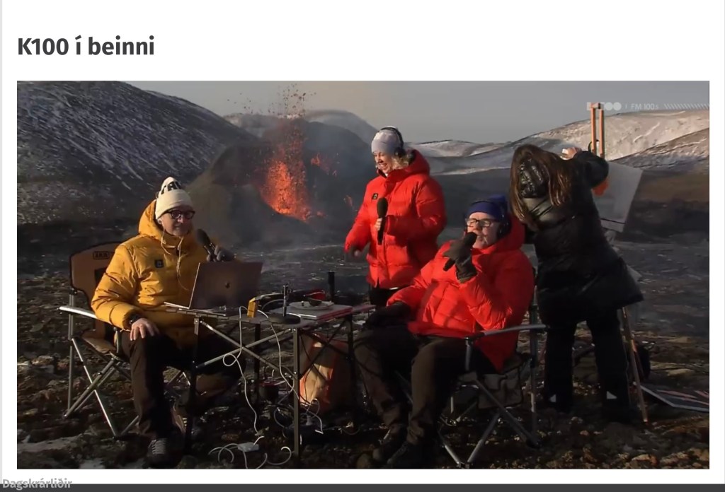 Morgonstudion har flyttat ut till vulkanen Kanske att det kan ses i efterhand via denna länk: https://k100.mbl.is/live/ Dela det här: Dela på X (Öppnas i ett nytt fönster) X Dela på Facebook (Öppnas i ett nytt fönster) Facebook Gilla Laddar in … Relaterade