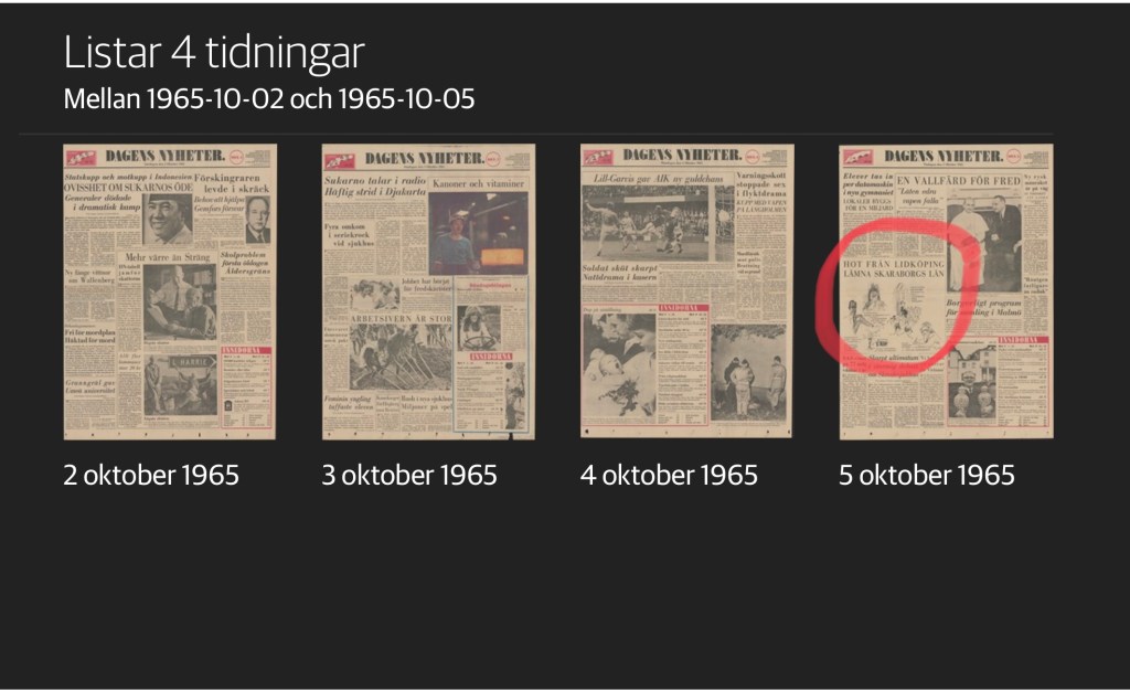 I samband med att vi sökte efter en födelseannons hittade vi en braskande nyhet på en av DN’s förstasidor i början av oktober 1965.