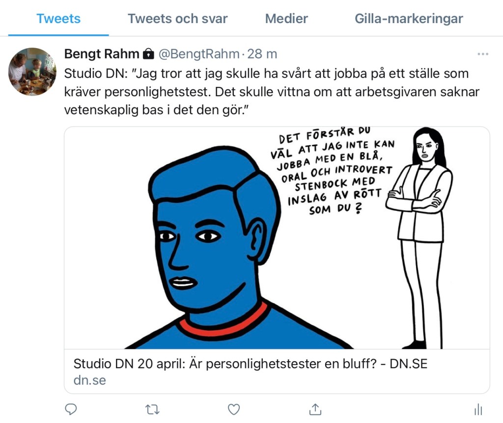 ”Jag är tacksam över att inte behövt göra något och sluppit ta ställning, men jag tror att jag skulle ha svårt att jobba på ett ställe som krävde personlighetstest. Det skulle vittna om att arbetsgivaren saknar vetenskaplig bas i det den gör.”