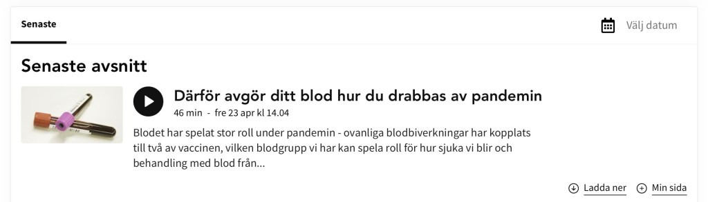 ”Kort sagt, det senaste året har vi insett att blodet är ännu mer komplicerat och viktigt än många av oss kanske visste tidigare. Vetenskapspodden handlar om blod och covid-19. Vi fördjupar oss i de ovanliga biverkningar med blödningar och blodproppar samtidigt som har kopplats till två av vaccinen. Vad beror de på och hur kommer det sig att de allra mest drabbar kvinnor, som är under 65 år? I början av pandemin hyste många stora förhoppningar till en sorts nödbehandling av svårt sjuka, med blodplasma från tidigare tillfrisknade. Det är en gammal metod som hade effekt under spanska sjukan och också använts vid ebola och sars till exempel. Det kallas konvalescent-plasma. Men det visade sig inte kunna hjälpa så många covidsjuka. Ändå finns det ett par patientgrupper där det är effektivt, berättar forskare. Tidigt kom också tecken på att personer med vissa blodgrupper antingen är mer skyddade eller mer utsatta för covid-19. Nu har flera studier bekräftat ett sådant samband, och vi hör mer om det. Blodgivningen har minskat under pandemin sannolikt är vissa blodgivare oroliga att uppsöka blodcentralerna, trots att det införts många nya säkerhetsåtgärder. Vi hör också om blodgivningens historia – i slutet på 1800-talet var blodgivarna lamm och det var en riktig ”hype” kring det i flera länder. Hur blev det så? Programledare: Lena Nordlund Producent: Björn Gunér Ljudtekniker: Olof Sjöström”