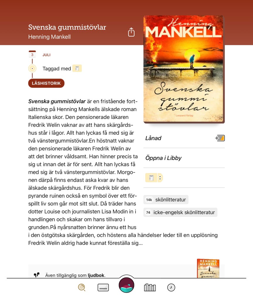 Svenska gummistövlar Snabbt läste jag ut Mankells underbara Italienska skor. Nu kastar jag mig över fortsättningen. Dela det här: Dela på X (Öppnas i ett nytt fönster) X Dela på Facebook (Öppnas i ett nytt fönster) Facebook Gilla Laddar in … Relaterade