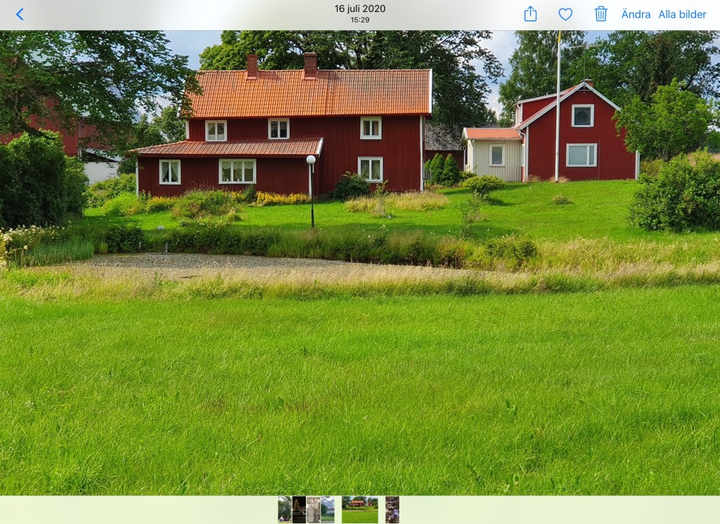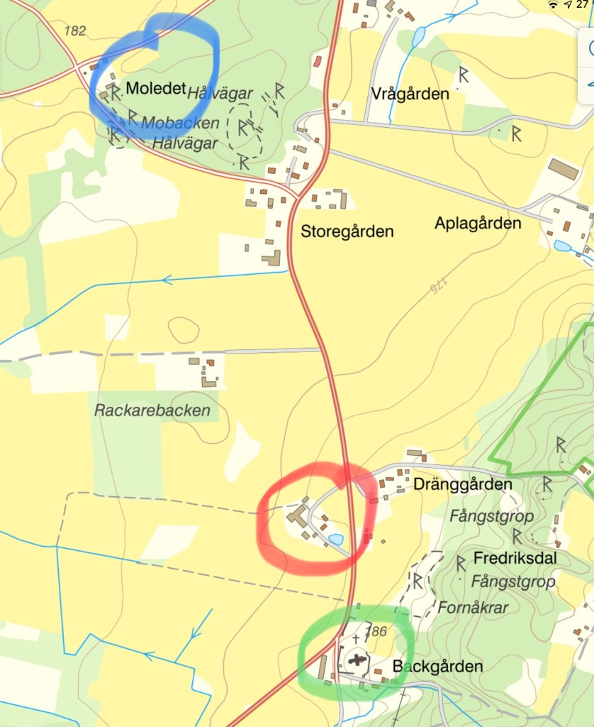 På Mossagården (röd ring) växte mormor upp. På Moledet (blå ring), dryga 500 meter därifrån, växte morfar upp. Det betyder att 50% av mina gener har sitt ursprung i denna vackra bygd. Och samma är det för den som fotade Mossagården förra sommaren, dvs min bror.