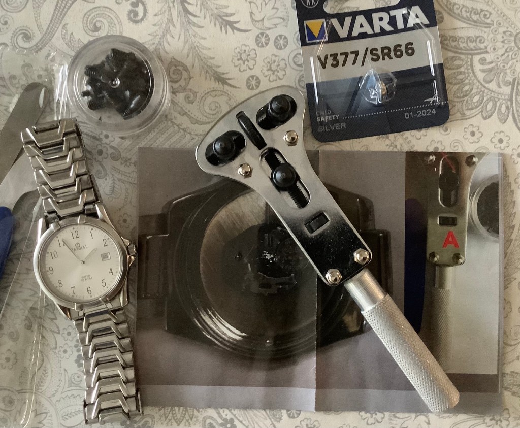 Med min boettöppnare byter jag batteri i min fars gamla klocka. Bytet kostar inte mer än batteriet (39 kr). Hade jag gått till någon av stadens urmakare kunde det ha gått på 250 kr.