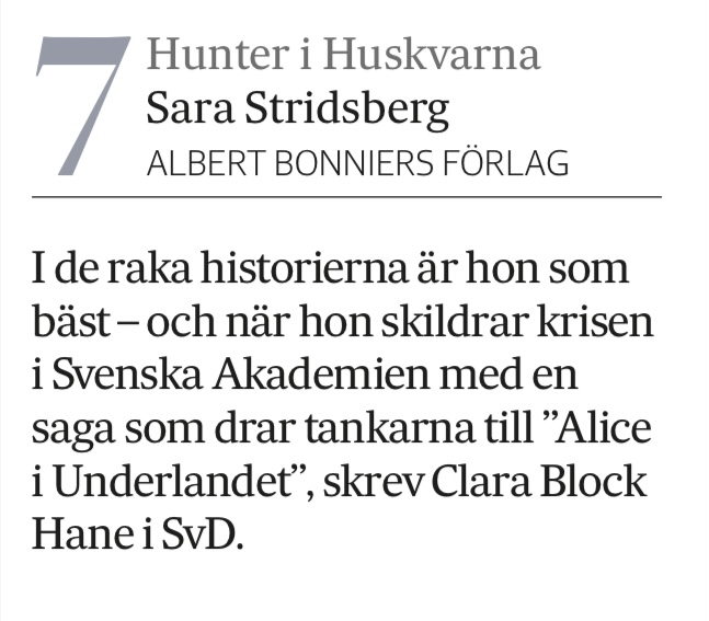Jag har precis läst ut en bok skriven av Ellen Mattson, hemmahörande på stol nr 9 i Svenska Akademien. Nu är det dags för nästa kvinna, dvs Sara Stridsberg på stol nr 13. Men hon valde att lämna Akademien i spåren metoo-krisen. Hon sitter numera på stol nr 6, i Samfundet De Nio.