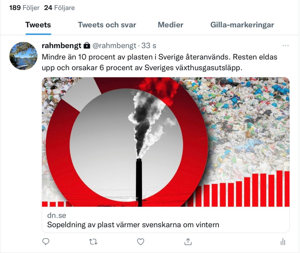 Men i DN läser jag en artikel med dystert innehåll. Av all den plast vi använder i landet återanvänds inte ens 10%. Resten eldas upp i våra fjärrvärmeverk och ger därvid upphov till enorma utsläpp av växthusgaser.