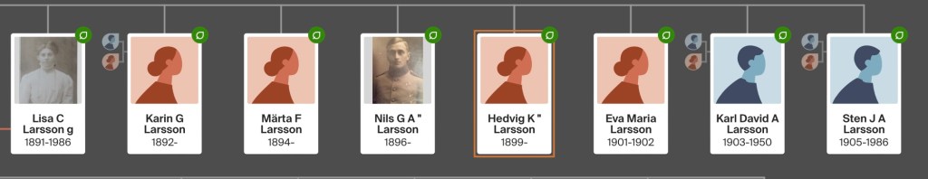 Och här nere har vi hela syskonskaran (Ancestry). Hedvig K står för Hedvig Kristina som kom att kallas Stina. Nils G A står för Nils Gustaf Andreas, men av det blev det Gösta!