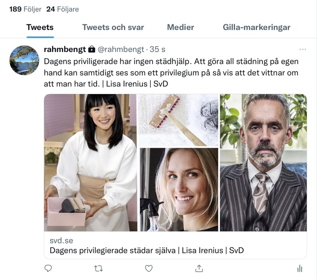Bloggaren: De som har privilegiet att ha gott om tid (och gärna vill skylta med det offentligt) kanske borde fundera på att hjälpa ensamstående mödrar med städ och byk.