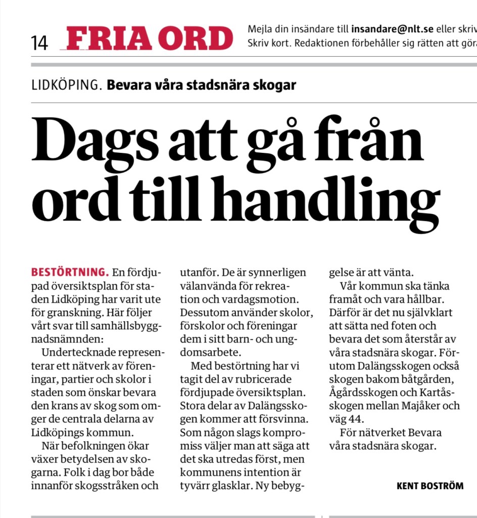 Det räcker med att ett skogsparti har drabbats av granbarkborren för att partiets företrädare skall börja fundera på att omvandla skogen till bostadskvarter (jag tänker t.ex på det drabbade skogsområdet väster om vägen mot Läckö, i höjd med Ulriksdal/Stenhammar).