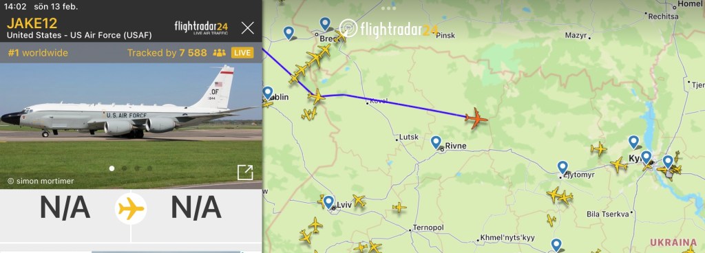 Trots uppgifter om att USA har upphört med allt flyg över Ukraina (förutom obemannade spionplan) ser man detta på Flygradarn vid 14-tiden idag söndag: