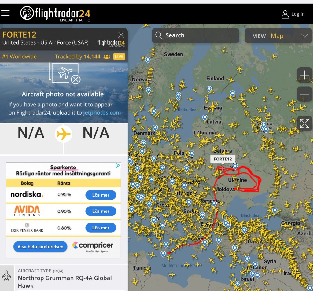Hela natten har det här spionplanet från U.S. Air Force svävat över Ukraina. Det tycks ha startat alldeles öster om Sicilien, troligen från ett stort hangarfartyg.
