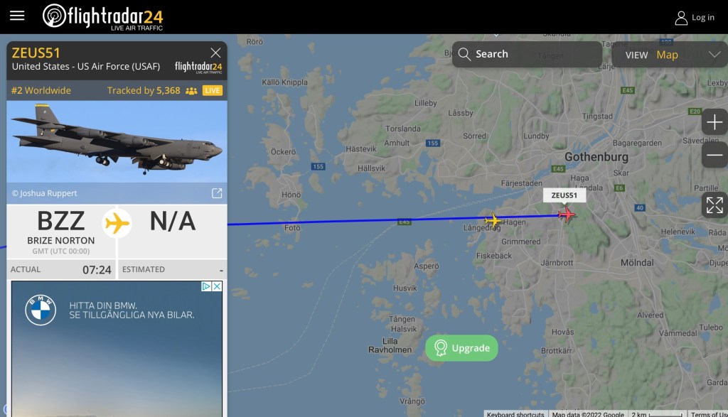 Passerade nu Borås 09.50. Jönköping 09.55. Gotland i sikte? Vetlanda 10.00. Undrar vad Åsa Nisse skulle ha tänkt om Putin om han hade stått i Knohult och betraktat bombplanen. Oskarshamn 10.05. Svänger västerut och passerar Hultsfred 10.10.