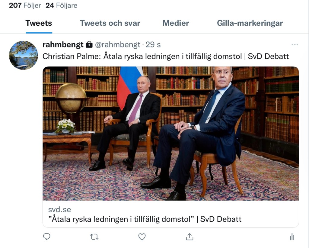 Ett åtal i en internationell tribunal mot Putin, Lavrov och Sjojgu skulle innebära att de reellt blev fredlösa i det internationella samfundet. De skulle inte längre kunna lämna Ryssland, inte ens för att besöka de fåtaliga länder där de ännu är tolererade. Detta skulle vara en dramatisk och avslöjande signal till det ryska folket om den enorma brottslighet som deras ledare bär ansvar för.