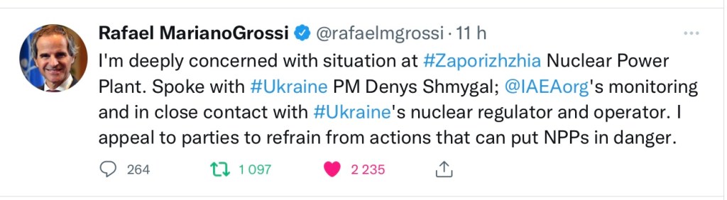 Generaldirektören vid Internationella atomenergiorganet är bekymrad över situationen vid Zaporizhzia Nuklear Power Plant Dela det här: Dela på X (Öppnas i ett nytt fönster) X Dela på Facebook (Öppnas i ett nytt fönster) Facebook Gilla Laddar in … Relaterade
