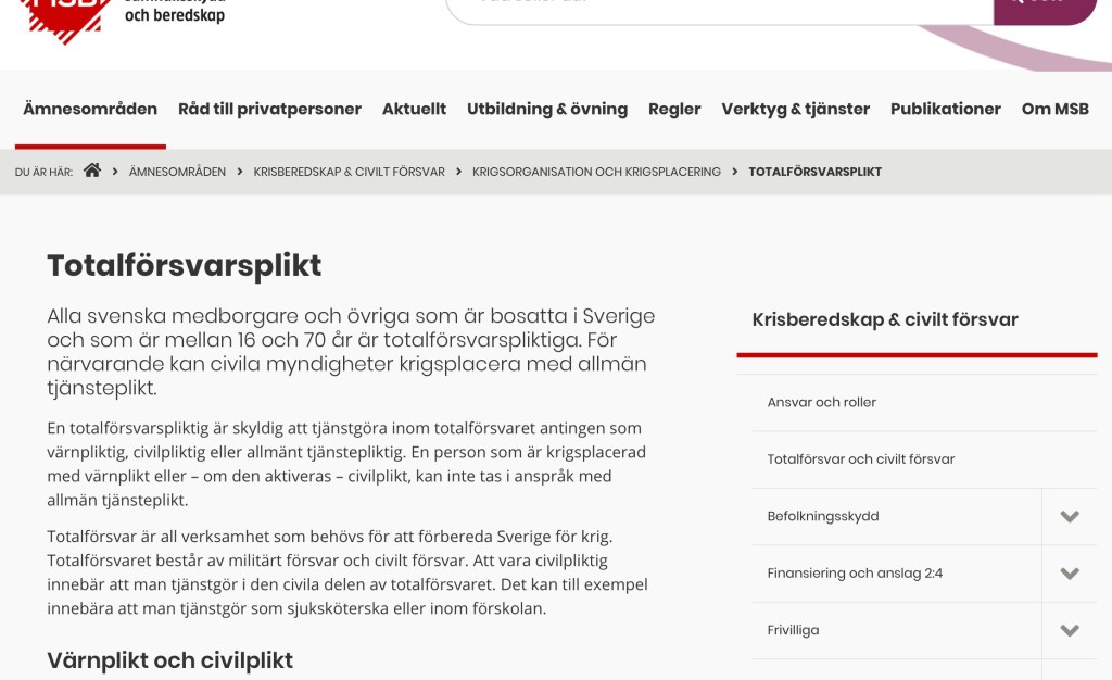 Totalförsvarsplikten Den gäller även för bloggaren. https://www.msb.se/sv/amnesomraden/krisberedskap–civilt-forsvar/krigsorganisation-och-krigsplacering/totalforsvarsplikt/ Dela det här: Dela på X (Öppnas i ett nytt fönster) X Dela på Facebook (Öppnas i ett nytt fönster) Facebook Gilla Laddar in … Relaterade