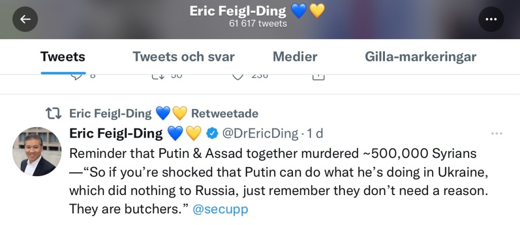 Min favorit-epidemiolog Eric Feigl-Ding påminner oss om Putins exempellösa mördande i Syrien Dela det här: Dela på X (Öppnas i ett nytt fönster) X Dela på Facebook (Öppnas i ett nytt fönster) Facebook Gilla Laddar in … Relaterade
