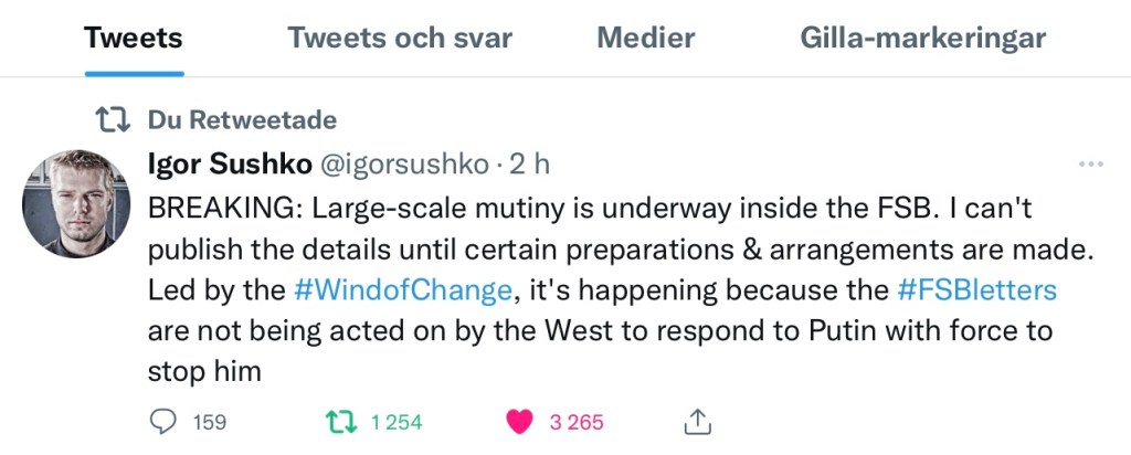Ett stort myteri är på gång inom den ryska säkerhetstjänsten (FSB) Målet för myteristerna sägs vara att försöka övertyga Väst om vikten av att svara militärt på Putins folkmord i Ukraina Dela det här: Dela på X (Öppnas i ett nytt fönster) X Dela på Facebook (Öppnas i ett nytt fönster) Facebook Gilla Laddar in … Relaterade