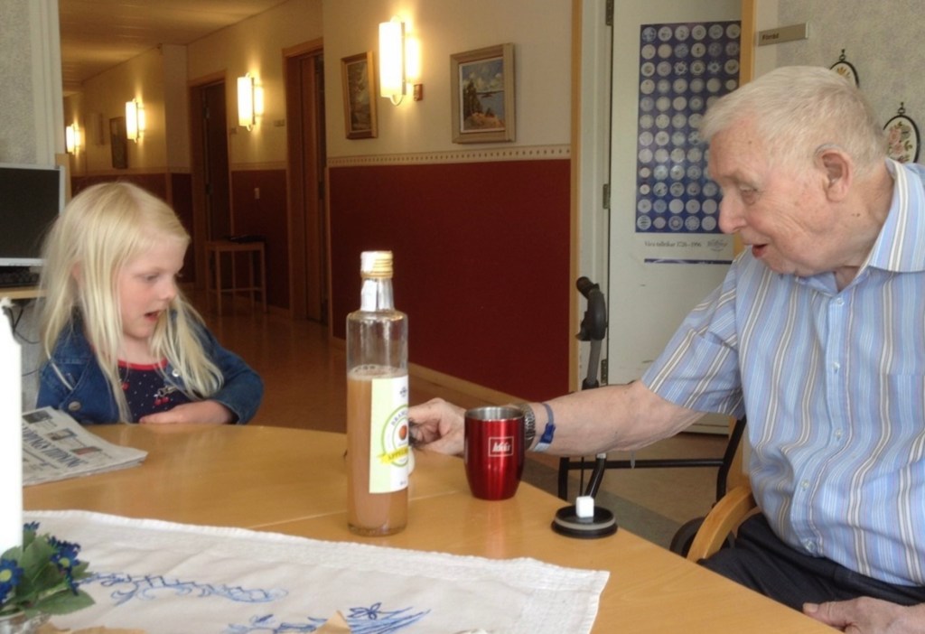 Här sitter han på Korttiden några månader senare och lattjar med barnbarnsbarnet Luma.
