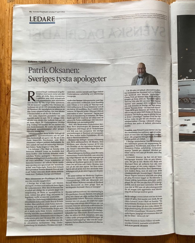 I Sverige har vi sett höger och vänster, näringsliv, forskare och kulturelit bana vägen för ryska intressen. Efter den 24 februari har vi också sett väldigt lite av genuin ånger och omprövning, de flesta av apologeterna är tysta.”