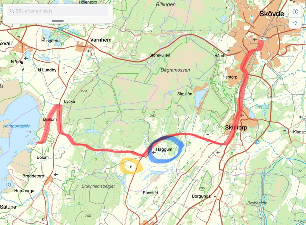 Men glöm inte att svänga höger innan den gula inringningen. Det är där Skam hör hemma, i det söndertrasade landskapet där Ranstadverket under 1960-talet utvann Uran ur alunskiffern.