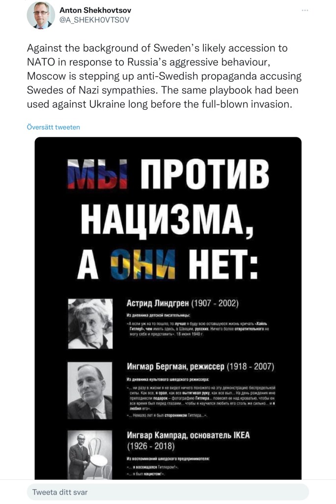 ”I Ryssland har Kreml dragit igång en reklamkampanj där Sverige utmålas som nazister. Detta är alltså samma retorik som användes mot Ukraina inför anfallet mot Ukraina. Annonser har dykt upp på bland annat busshållplatserna i Moskva.”