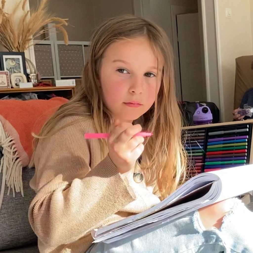Saga började måla av morfar. (Den observante kan se ett litet, litet foto bakom Saga, på hennes morfars mor)!