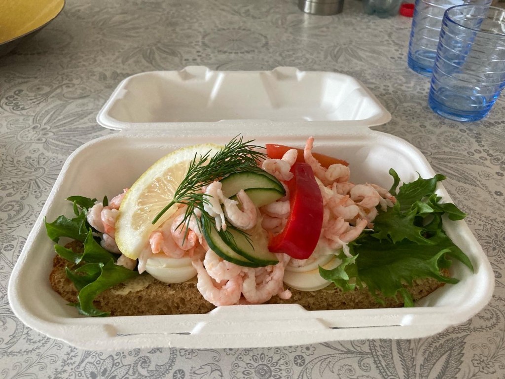 En räkmacka räcker gott och väl till två, åtminstone den man inhandlar på Skogshyddan!!