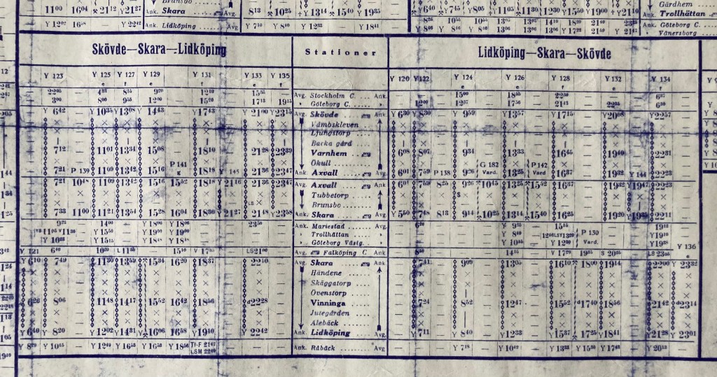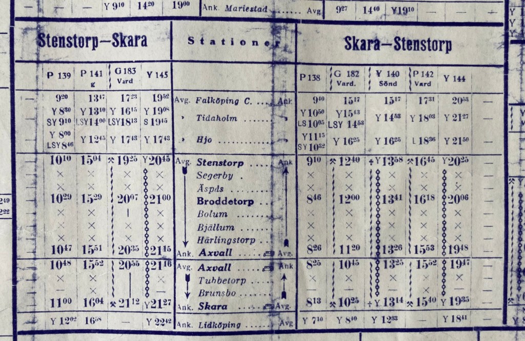 Jag har faktiskt rest med tåget mellan Stenstorp och Skara. Det torde ha varit i slutet av 1950-talet. Antagligen skulle någon moster, morbror eller faster hälsas på.