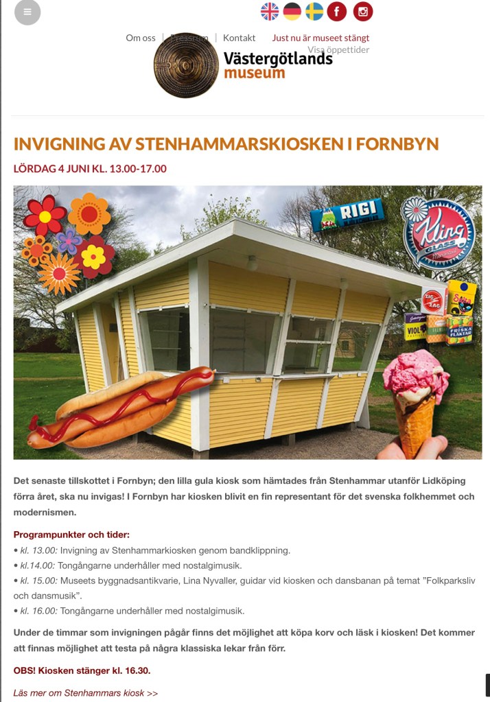 ”Den lilla gula kiosken hämtades från Stenhammar utanför Lidköping 2021. Den byggdes 1961 efter ritningar av Erik Stadig, Lidköping, på uppdrag av förste ägaren Ingvar Svensson. Under lång tid var kiosken ett givet stopp vid den gamla landsvägen ut mot Läckö. Här såldes glass, tidningar och sötsaker. Idag är den här typen av byggnader utrotningshotade. Stenhammarkiosken har behållit sitt ursprungliga utseende och är ett fint prov på 1950-talets ”funkis”, i Fornbyn står den som en representant för det svenska folkhemmet och modernismen. Kiosken restaureras under 2022.”