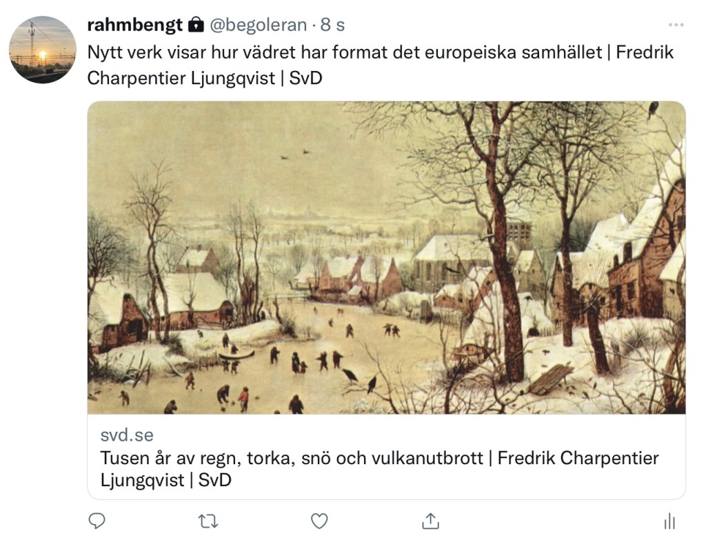 Ett nytt standardverk inom klimathistoria har just utkommit, nämligen boken ”Climate and society in Europe: The last thousand years (Bern: Haupt Verlag) av Christian Pfister och Heinz Wanner. Författarna är professorer emeritus i historia respektive geografi vid Berns universitet