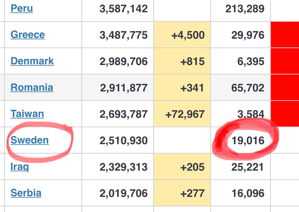 Mer än 19.000 svenskar har nu avlidit efter att ha drabbats av Covid-19 Men vad jag vet har detta inte på något sätt uppmärksammats av media. Tidningar, radio, TV – alla tiger som muren. Varför? Dela det här: Dela på X (Öppnas i ett nytt fönster) X Dela på Facebook (Öppnas i ett nytt fönster) Facebook Gilla Laddar in … Relaterade