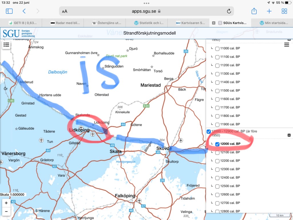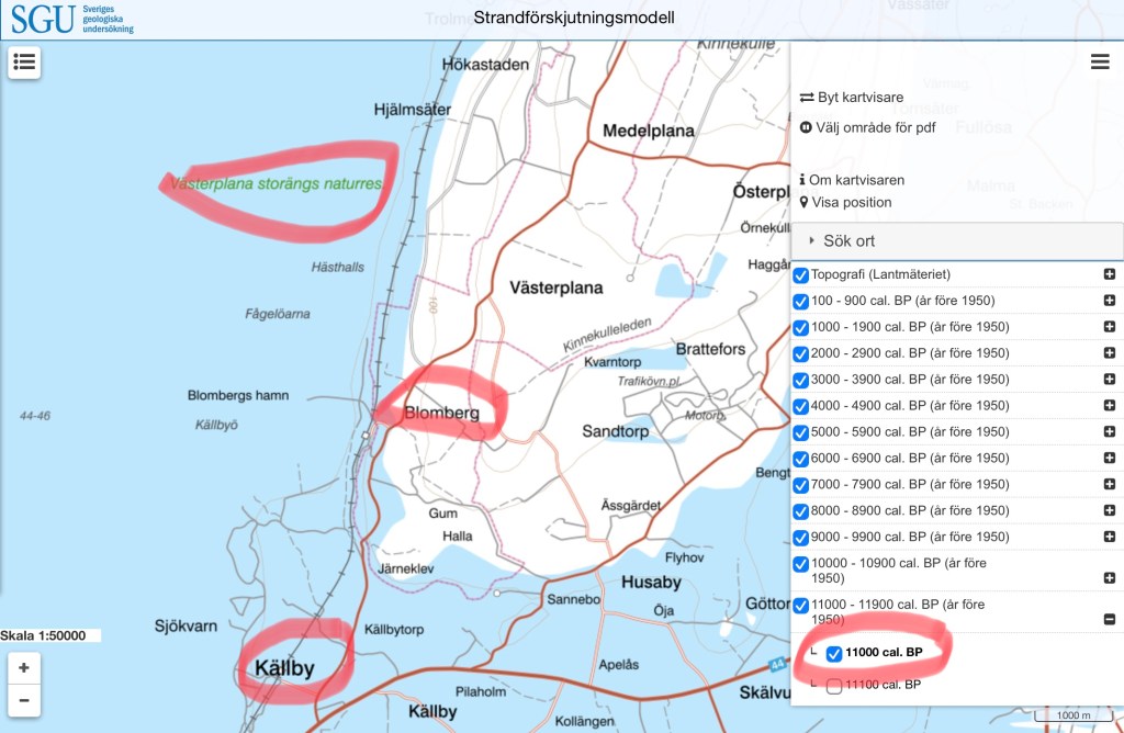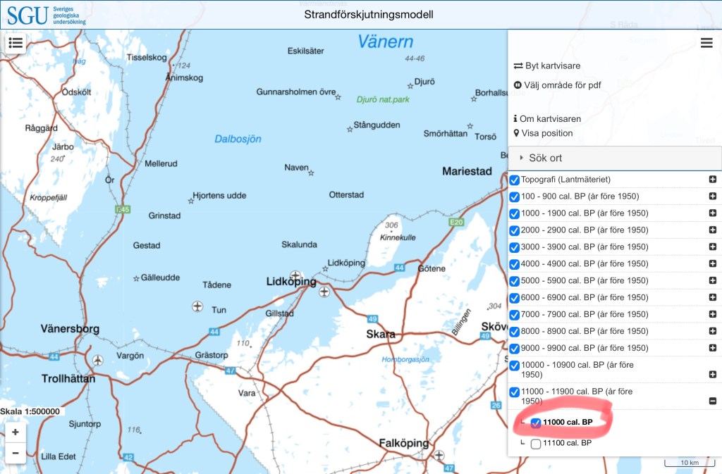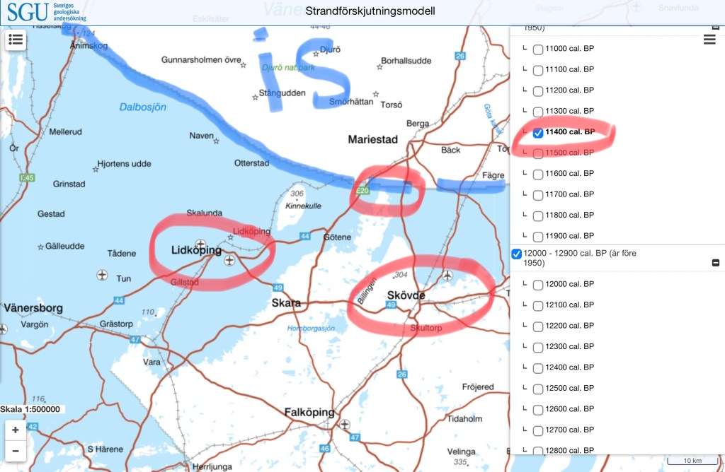 Det är min ena svärson som har tipsat mig om SGU:s strandförskjutningsmodell som visar en övergripande bild av den forntida fördelningen mellan hav och land samt även förändringar i sjöarnas utbredningar: