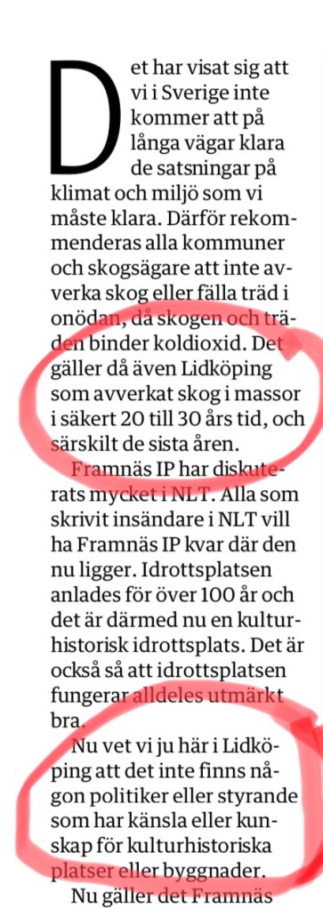 I dagens NLT finns det en synnerligen klok insändare, signerad Tore Granbom. Tore vill bevara den kulturhistoriskt värdefulla idrottsplatsen vid Framnäs. Det vill inte majoriteten av partierna.