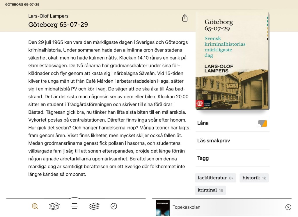 Lars-Olof Lampers skildring av ”grodmansrånet” i Göteborg 1965 släpper inte taget om läsaren. Men boken drivs inte av spänningen, utan av bilderna av en tid och av ett land.