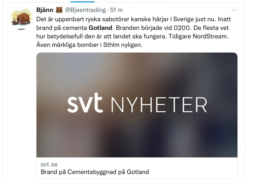 Det är med stor sannolikhet ”Den ryska björnen” som ligger bakom branden på Gotland Det enda de behövde var en miniubåt, några Spetsnazsoldater och en ask med tändstickor. Dela det här: Dela på X (Öppnas i ett nytt fönster) X Dela på Facebook (Öppnas i ett nytt fönster) Facebook Gilla Laddar in … Relaterade
