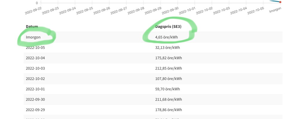 I morgon torsdag hamnar elpriset i elområde 3 på ynka 4,65 öre/kWh!