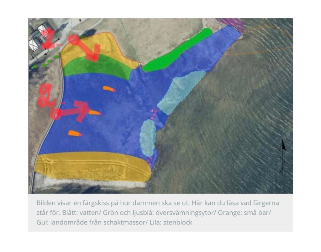 Skiss på den slutgiltiga utformningen av den damm som utgör en del av denna kompensation (fotoplatserna är markerade för de båda bilderna här ovan):