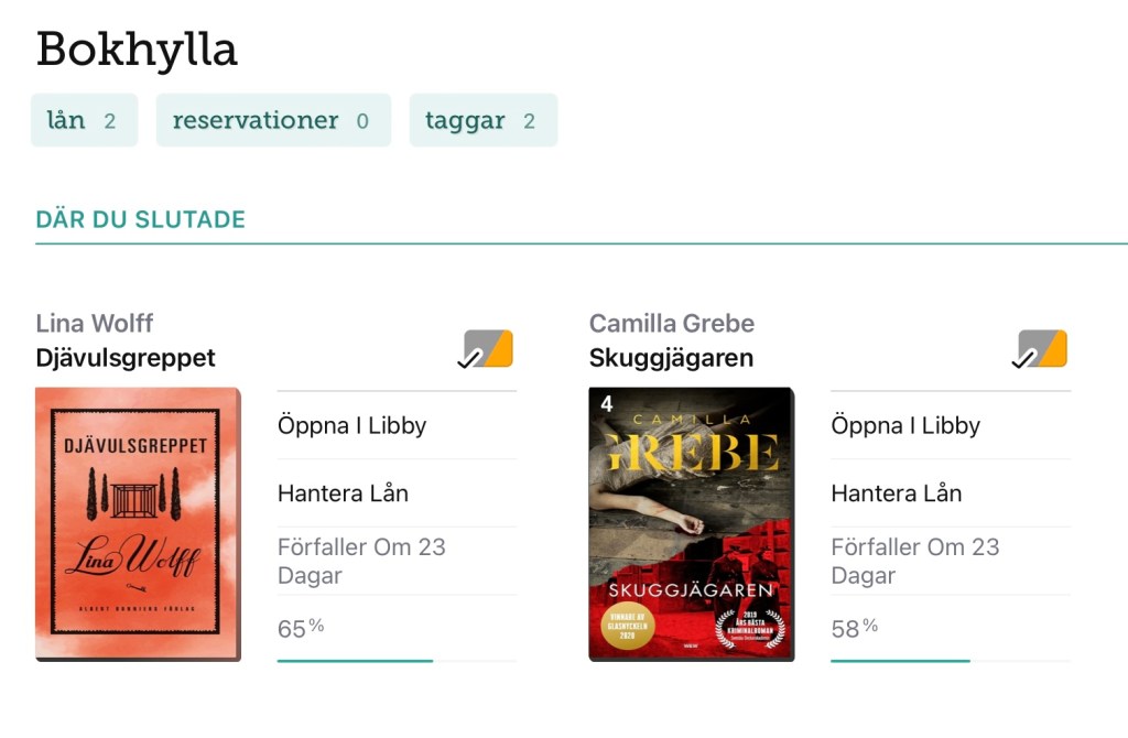 Två böcker på hyllan Just nu leder Djävulgreppet med några procent. Men Skuggjägaren lär snart vara ikapp. . Dela det här: Dela på X (Öppnas i ett nytt fönster) X Dela på Facebook (Öppnas i ett nytt fönster) Facebook Gilla Laddar in … Relaterade