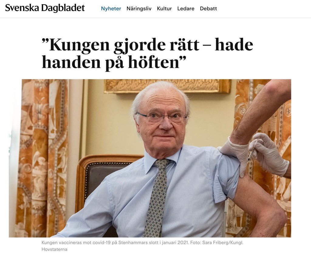 Jag blev glad när jag såg en bild på kung Carl XIV Gustaf när han tog sin spruta med handen på höften. Det är precis så man ska göra, sätta sin handflata på sin höftbenskam, detta säger Pelle Gustafson, chefläkare på LÖF, regionernas ömsesidiga försäkringsbolag