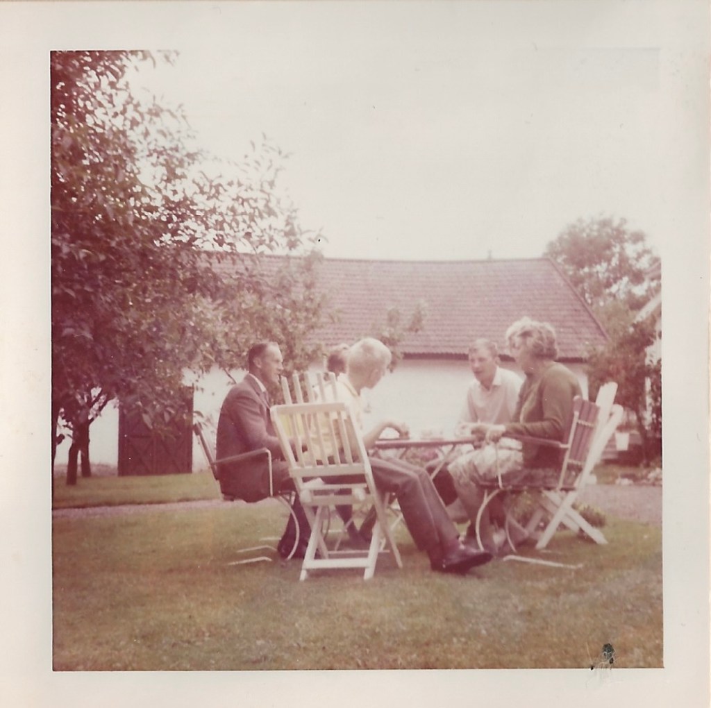 Här ser vi ett foto från Kvarnegården, möjligen taget 1964. Till vänster sitter morbror Ivar, skymd bakom mig anas min mor, till höger min kusin Uno och min ”giftasmoster” Rut. Min bror Stig lär ha varit fotograf.