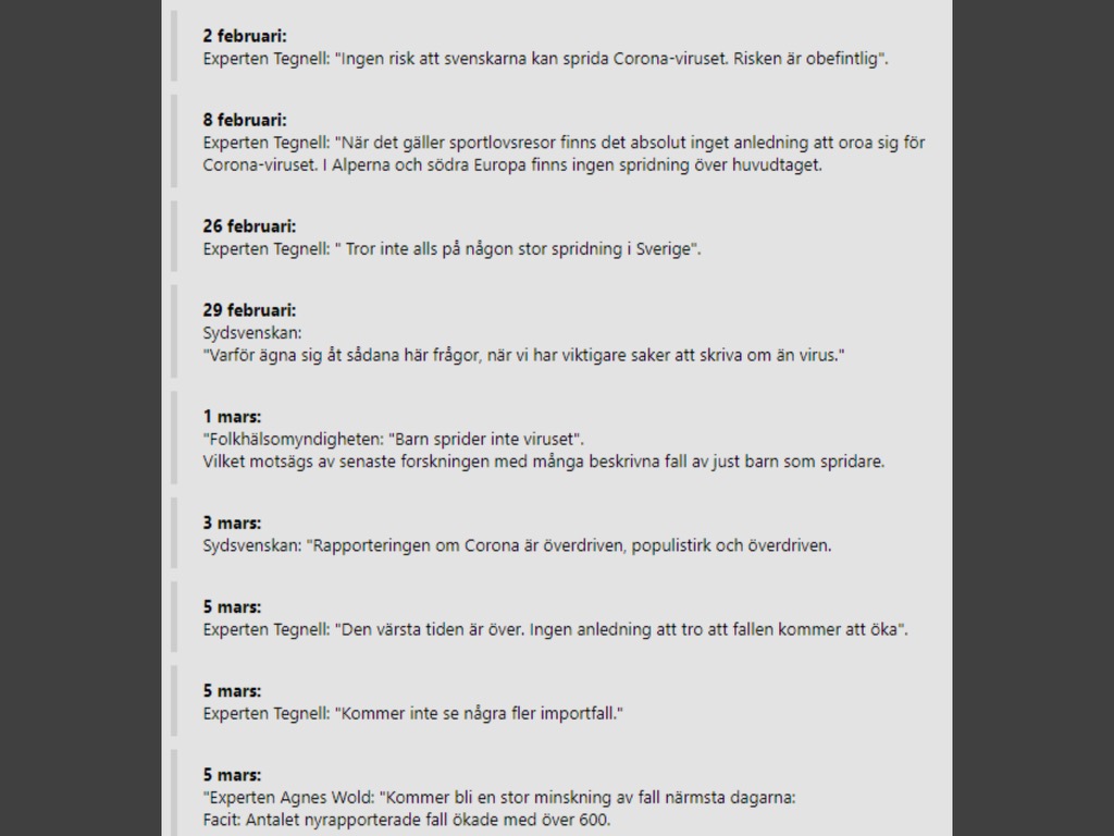 Första pandemivåren försökte myndigheterna slå blå dunster i ögonen på befolkningen Några expertuttalanden. Men det var som bekant alarmisterna som hade rätt. Dela det här: Dela på X (Öppnas i ett nytt fönster) X Dela på Facebook (Öppnas i ett nytt fönster) Facebook Gilla Laddar in … Relaterade